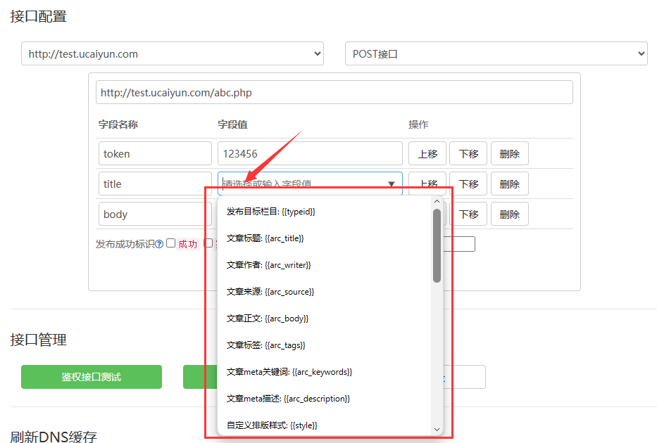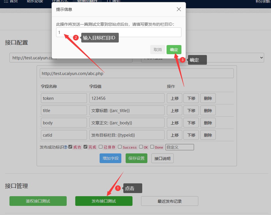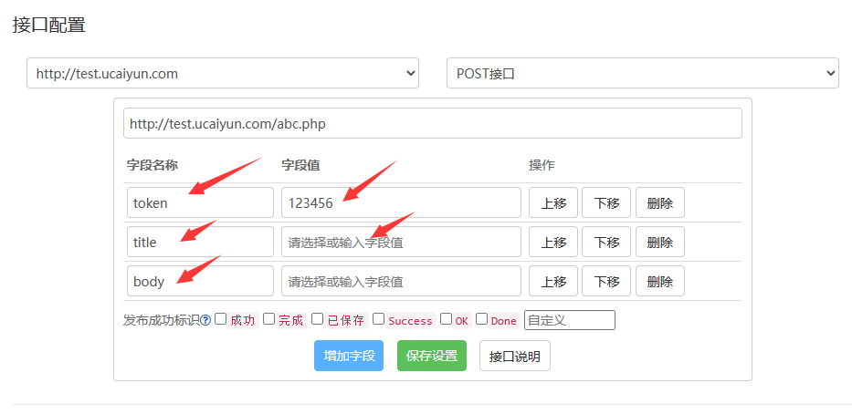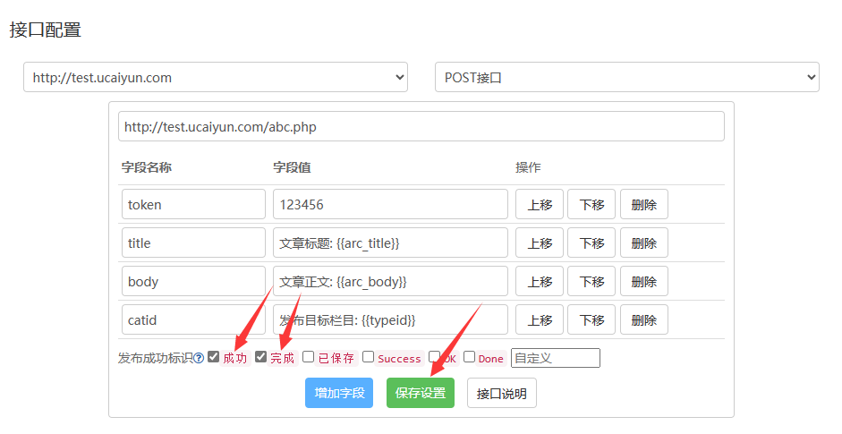發(fā)布成功標識的意思是,如果您的接口輸出信息包含所選字符,我們系統就認為文章保存是成功的,否則就認為是失敗的。注意發(fā)布成功標識可以是多個(gè),也可以是單個(gè),還可以用后面的自定義框輸入,所有勾選和輸入的字符串都會(huì )被視為發(fā)布成功。