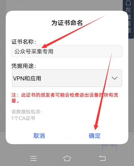 3. 輸入密碼后,就進(jìn)入了安裝流程,在證書(shū)名稱(chēng)處輸入一個(gè)名稱(chēng),比如叫公眾號采集專(zhuān)用,這個(gè)名稱(chēng)是任意的,不影響功能使用。然后點(diǎn)擊確定。
